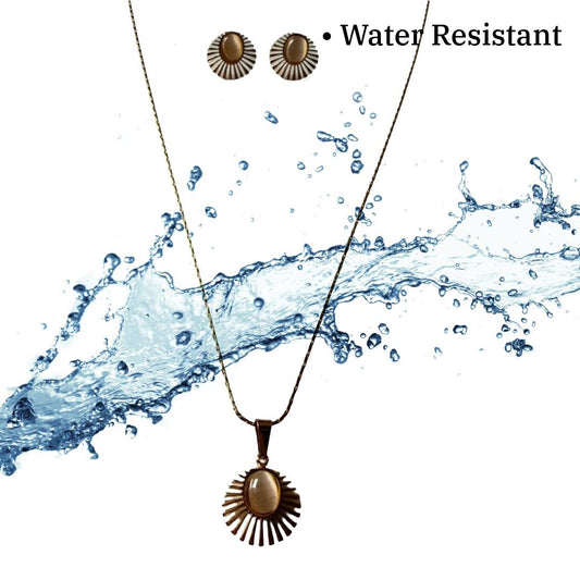Gold Plated Necklace and Earring Set with Black Stone Pendant, Sunburst Design Jewelry for Women, Anti Tarnish, Water Resistant