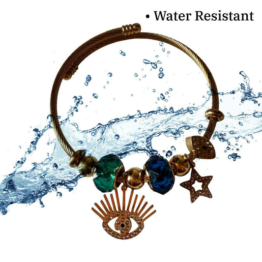 Stylish Cable Wire Bracelet for Women with Eye, Star, Moon Charms, Green and Blue Crystal Beads, Gold Plated, Anti Tarnish
