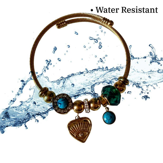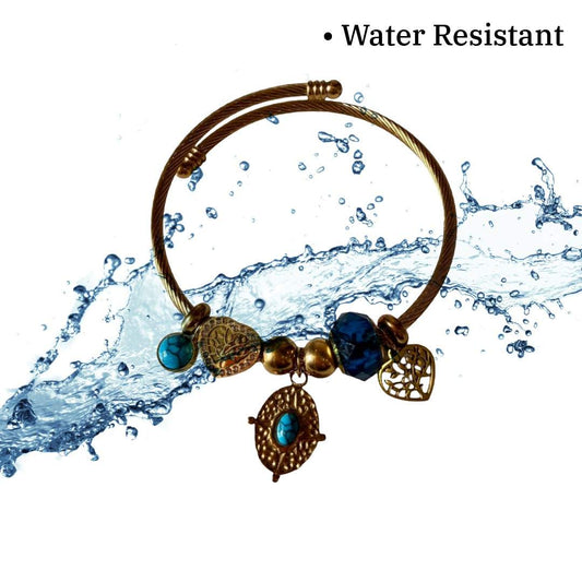 Stylish Charm Bracelet for Women, Bronze Twisted Cable Bangle with Tree of Life, Turquoise Beads, Blue Crystal, Heart Charms