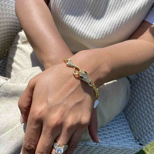 Studded Snake Bracelet For Women, Gold Plated Fashion Bracelet with Emerald Eyes, 6.5 cm, Anti Tarnish, Water Resistant, Lightweight, Gift Packaged