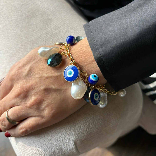 Evil Eye Bracelet With Lots Of Charms And Pearls | Anti-Tarnish | Water Resistant | Gift Box Packing