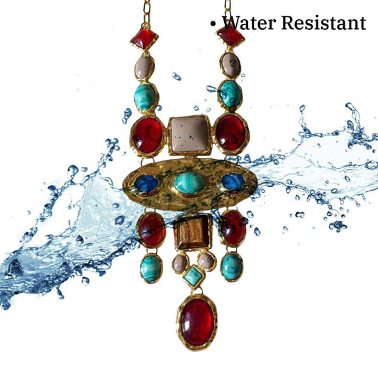 Statement Necklace, Turquoise and Red Gemstones, Gold-Plated Chain, Bohemian Design, Anti Tarnish, Water Resistant, Lightweight, Gift Packaged