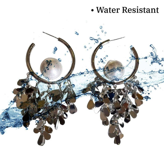 Statement Hoop Earrings with Cascading Silver Metallic Charms, 8 cm, Pearl Accent, Fashion Jewellery, Anti Tarnish, Water Resistant, Lightweight, Gift Packaged