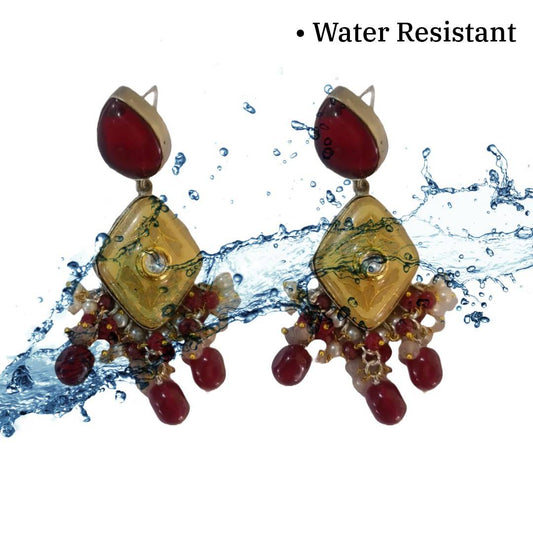 Western Style Dangle Earrings, 8 cm, Gold-Plated with Red Beads and Pearl Accents, Dangle Drop Design, Anti Tarnish, Water Resistant, Lightweight