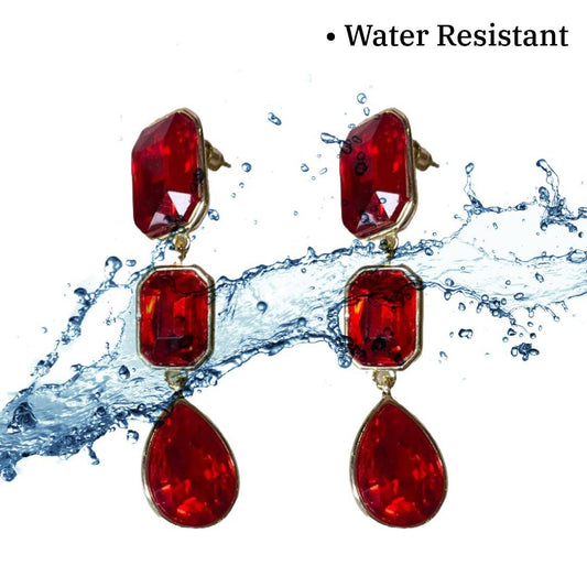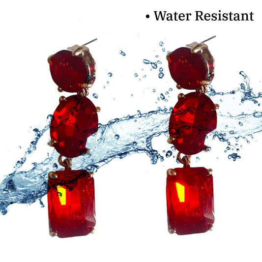 Crystal Drop Dangle Earrings For Women, 5.5 cm, Red Colour, Triple Stone Design, Anti Tarnish, Water Resistant, Lightweight, Gift Packaged