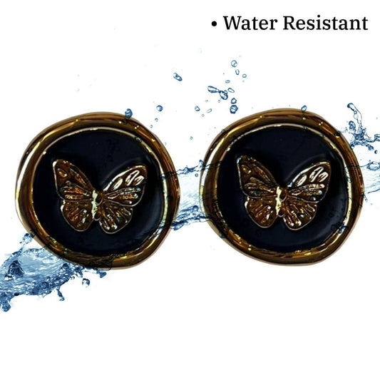 Black Earrings, Butterfly Stud Earrings For Women, 1.5 cm, Black and Gold Round Design, Anti Tarnish, Water Resistant, Lightweight, Gift Packaged