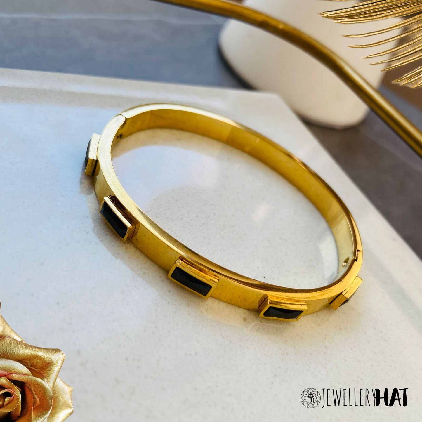 The striking contrast of the sleek black stones against a lustrous backdrop accentuates the bracelet's allure, offering a timeless yet bold statement piece. Each stone is meticulously hand-selected, ensuring that every bracelet exudes a unique charisma, making it an exquisite addition to your ensemble.