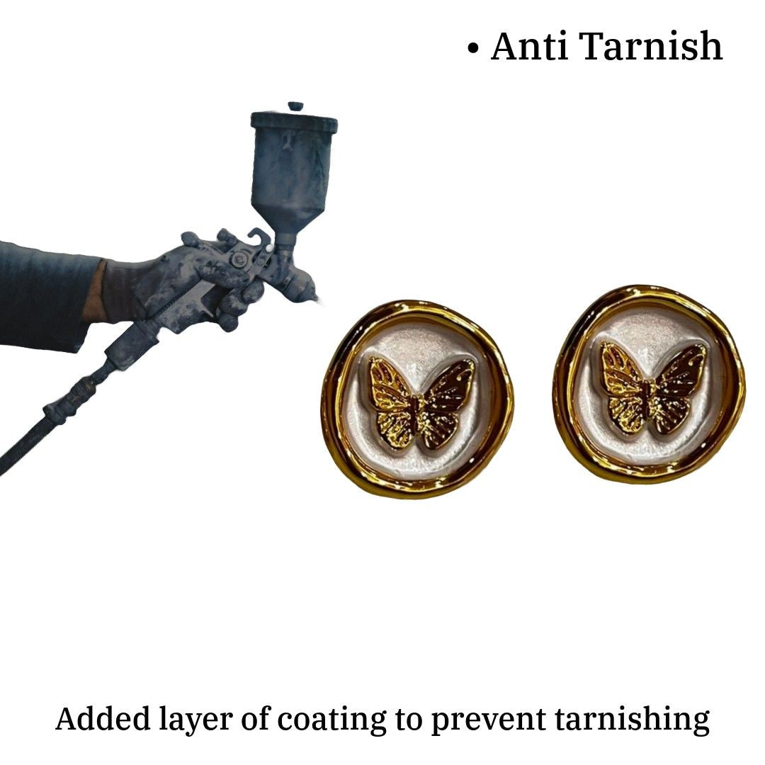 Each pair is carefully gold-plated for a radiant sheen that mimics the warmth of sunlight dancing on delicate wings. The pearl white background creates a serene canvas that enhances the butterfly’s graceful form, resulting in a piece that’s equal parts classic and contemporary.