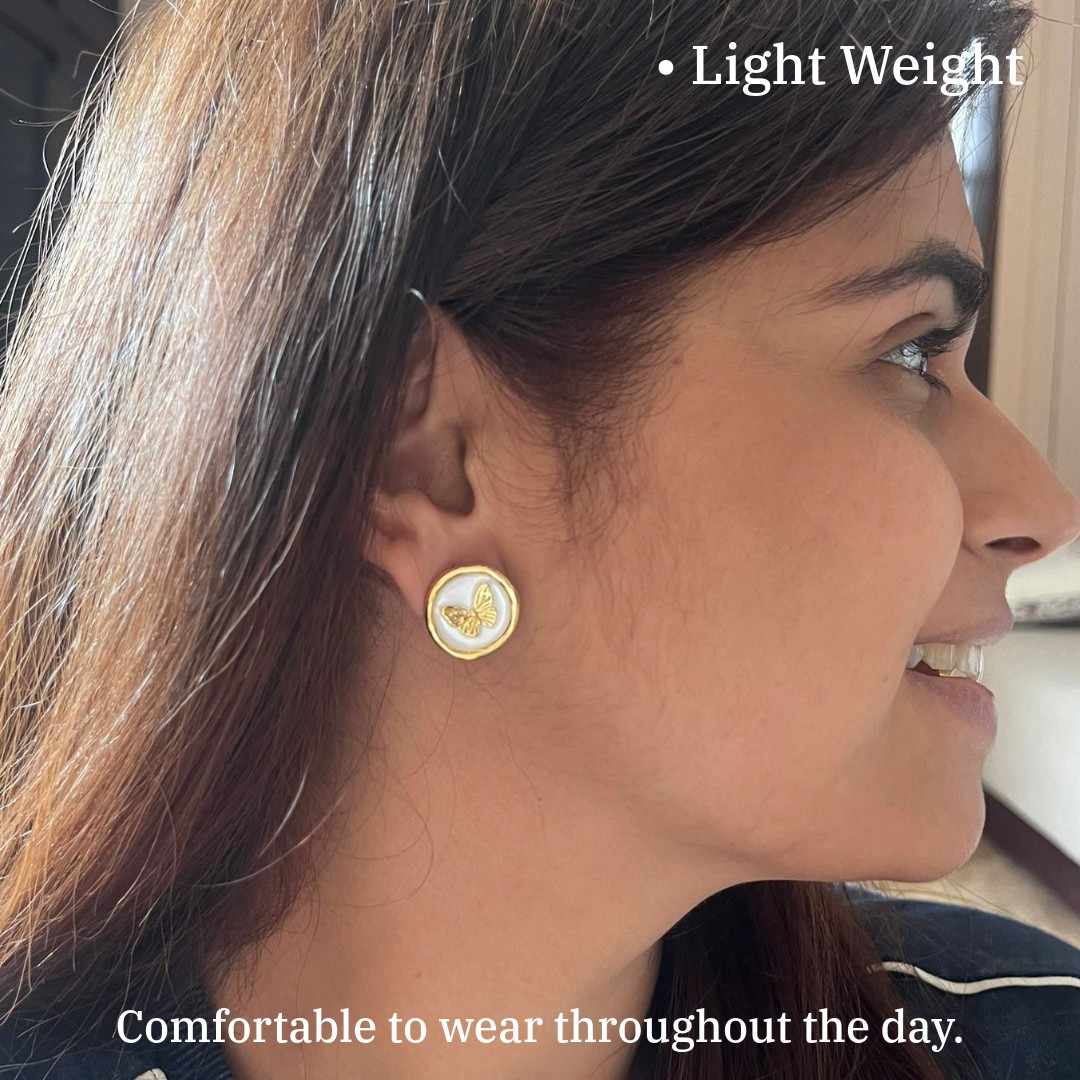 Coating : Gold Plated - Butterfly Round Stud Earrings, Gold-Plated, Pearl White Background, White Earrings, Anti Tarnish, Water Resistant, Lightweight, Gift Packaged