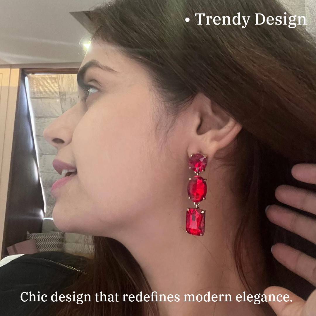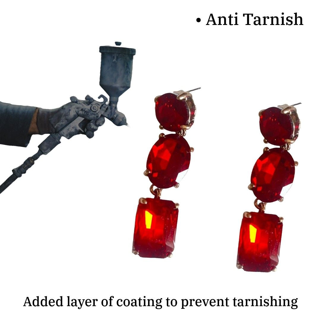 Contents : 1 Pair Of Crystal Drop Dangle Earrings For Women, 5.5 cm, Red Colour, Triple Stone Design, Anti Tarn