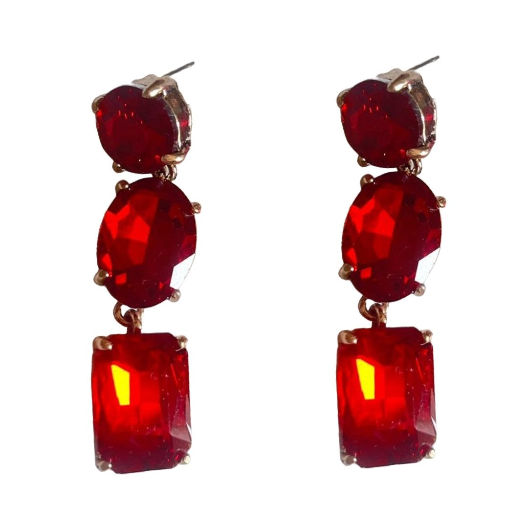 Size : As In Picture - Crystal Drop Dangle Earrings For Women, 5.5 cm, Red Colour, Triple Stone Design, Anti Tarnish, Water Resistant, Lightweight, Gift Packaged