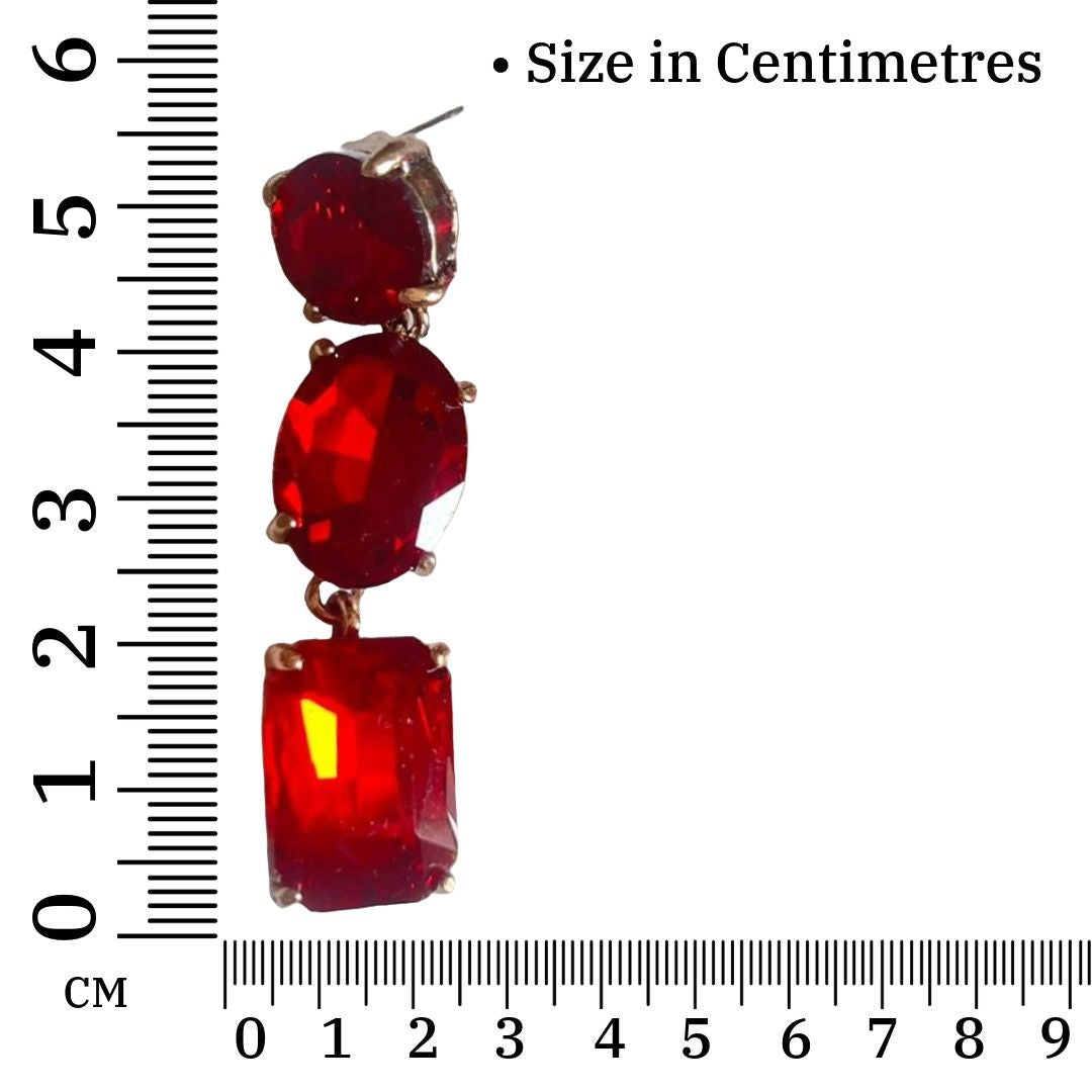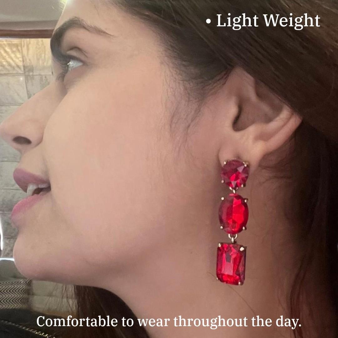 Lifetime Replacement Warranty Of Crystal Drop Dangle Earrings For Women, 5.5 cm, Red Colour, Triple Stone Design, Anti Tarnish, Water Resistant, Lightweight, Gift Packaged