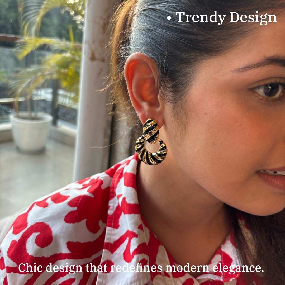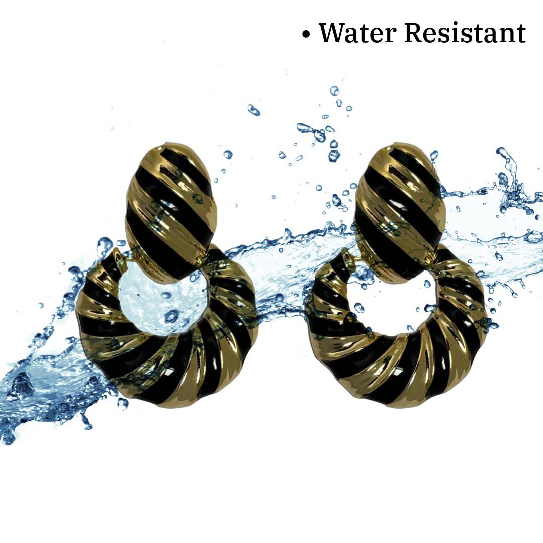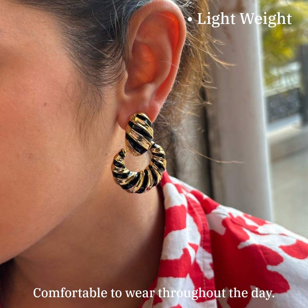 Introducing our exquisite Door Knocker Earrings—a harmonious blend of classic elegance and modern flair. Measuring 4.5 cm in length, these earrings feature a striking gold and black striped pattern that exudes sophistication. Designed as statement dangle pieces, they are both anti-tarnish and water-resistant, ensuring durability. Despite their bold appearance, they are lightweight, providing comfort for extended wear. Each pair is thoughtfully gift-packaged, making them an ideal choice for any special occasion.