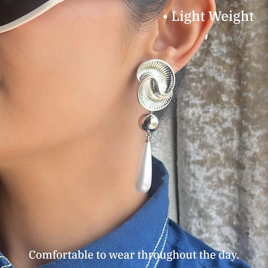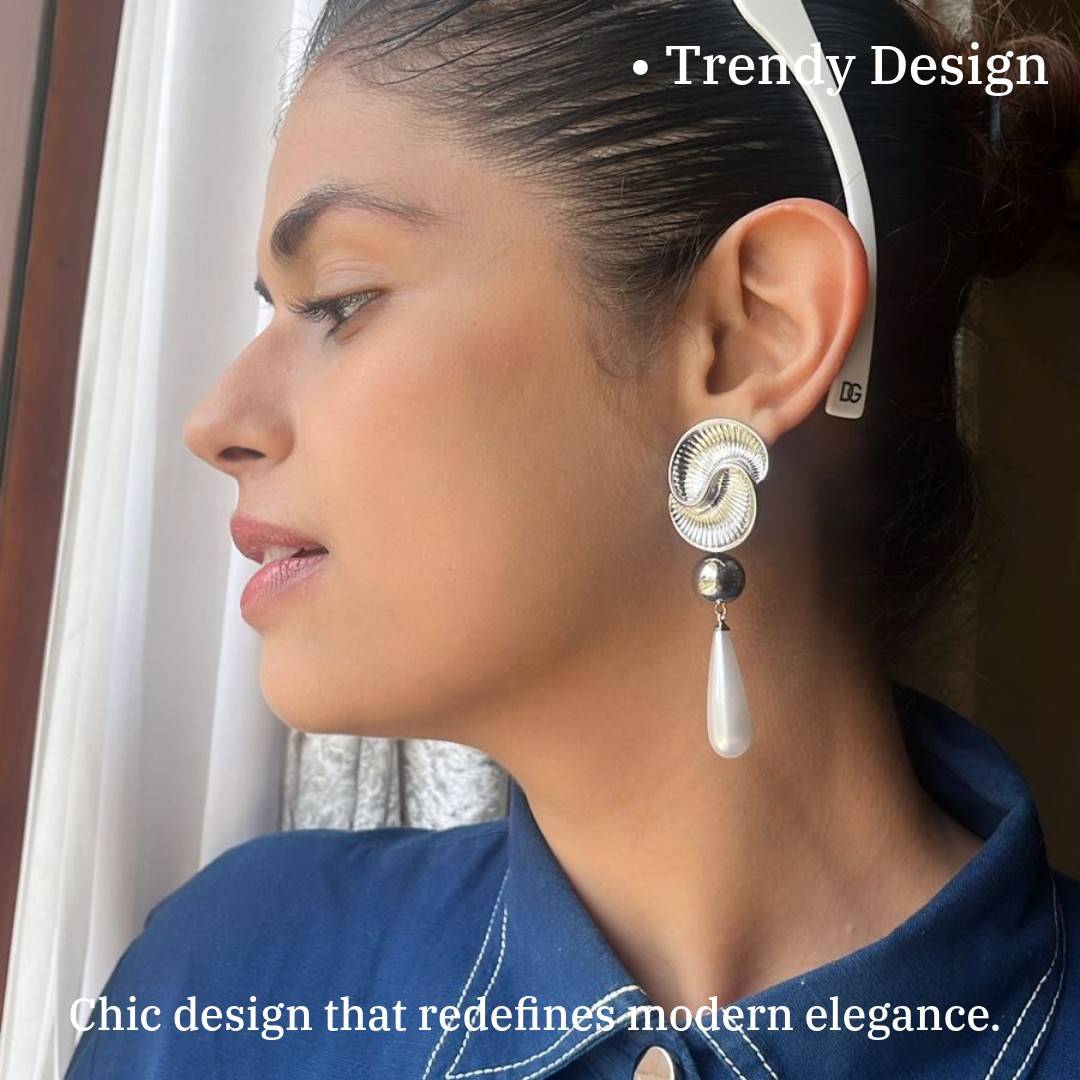 The Elegant Drop Dangle Earrings draw inspiration from the fluidity of modern femininity. The spiral design represents growth, continuity, and feminine energy—symbolic of every woman’s journey through life’s curves and triumphs. The pearl teardrop, universally admired for its purity and beauty, evokes serenity and poise.