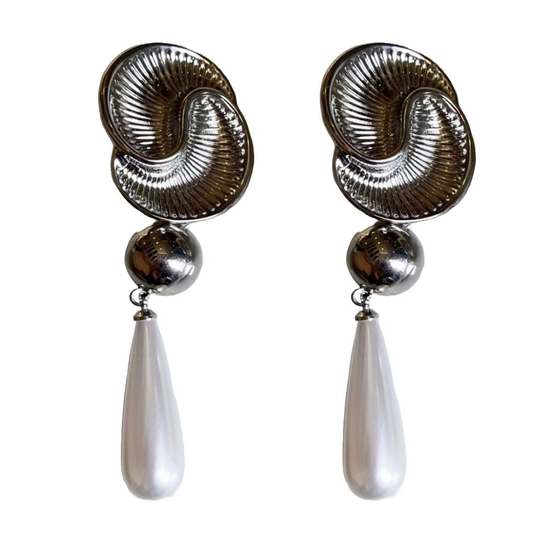 Base Material : Alloy - Elegant Drop Dangle Earrings, 7.5 cm, Silver-Plated Spiral Design with Pearl Teardrop, Dangle Style, Anti Tarnish, Water Resistant, Lightweight, Gift Packaged