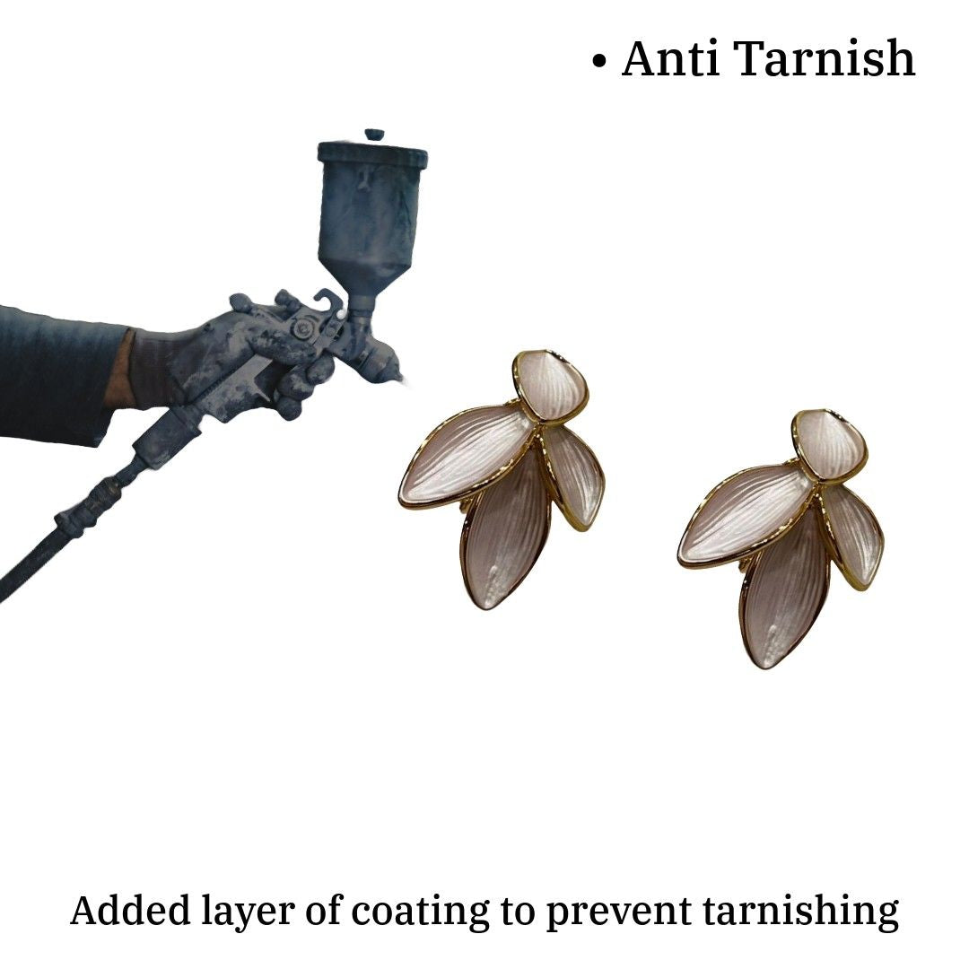 Coating : Gold Plated - Elegant Leaf Design Stud Earrings, Gold-Plated with Pearl White Enamel, White Earrings, Anti Tarnish, Water Resistant, Lightweight, Gift Packaged