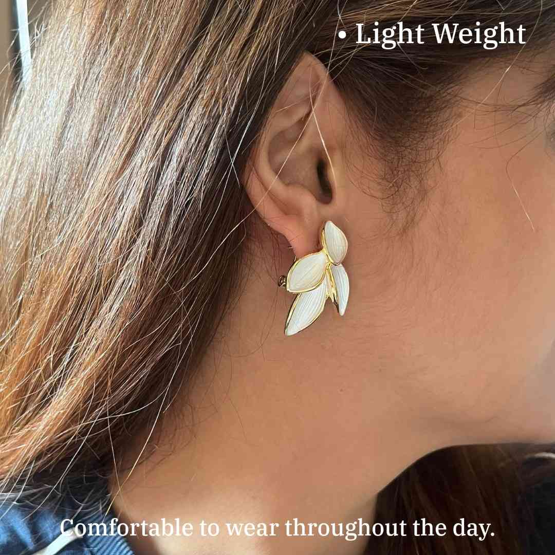 Elegant Leaf Design Stud Earrings, Gold-Plated with Pearl White Enamel, White Earrings, Anti Tarnish, Water Resistant, Lightweight, Gift Packaged