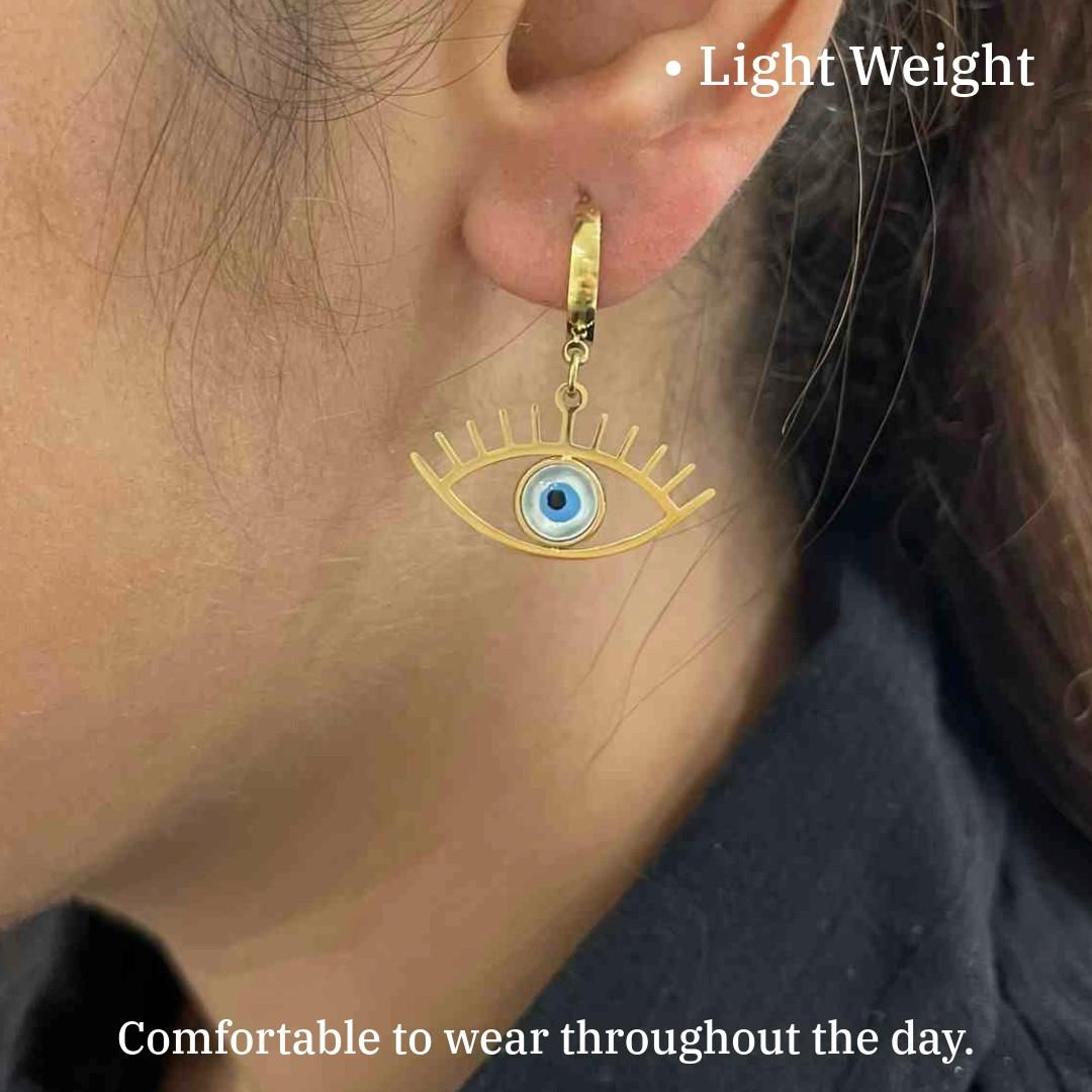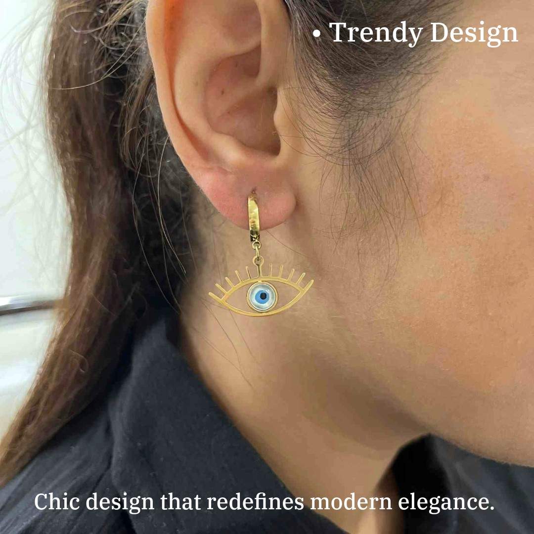 Versatility in Trendiness: Versatility is inherent in the design of these earrings. The gold Evil Eye motif, gracefully suspended as earrings, merges flawlessly with a trendy aesthetic. This allows for effortless integration into various fashion statements, making them suitable for both casual outings and formal events. The lightweight construction ensures comfort, and the secure fastening guarantees they stay in place, giving you the freedom to move with confidence.