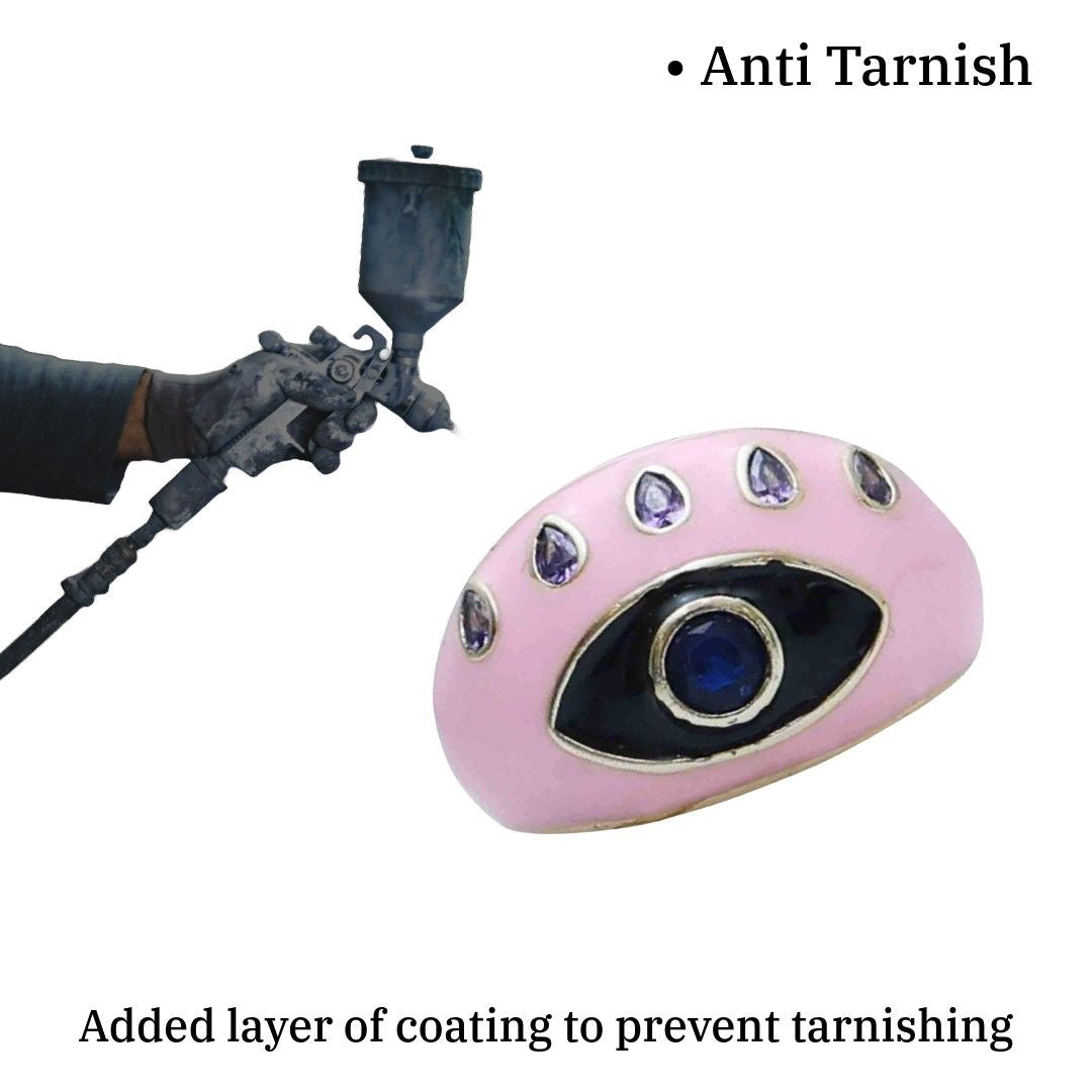 Bid farewell to the relentless battle against tarnishing. Our Gold Plated Evil Eye Ring is crafted with advanced anti-tarnish properties, ensuring that it retains its radiant luster, resisting the effects of time and wear. This ring stands as a beacon of positivity, always ready to complement your look with a touch of elegance.