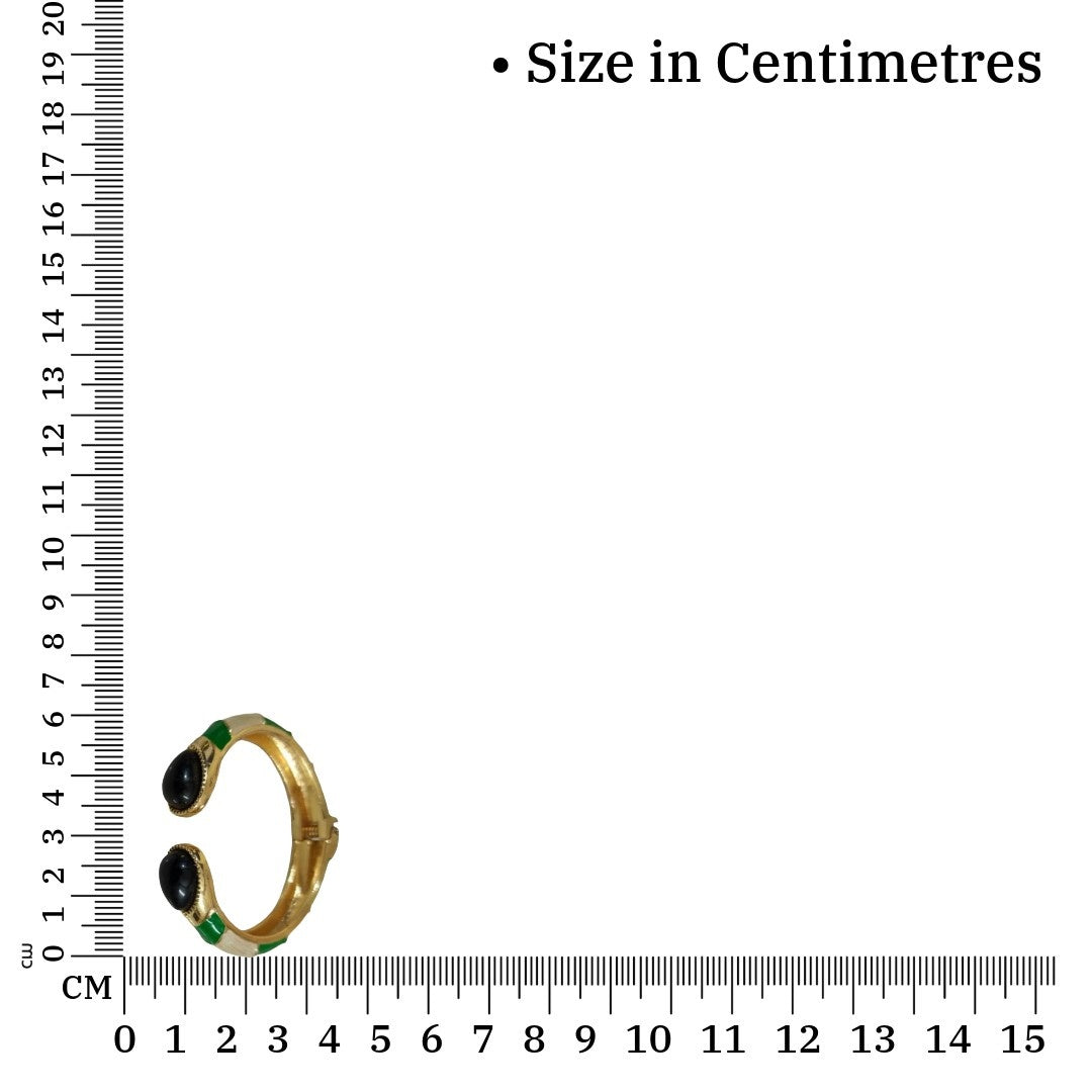 Contents : 1 Piece Of Gold Plated Cuff Bracelet with Black Oval Stones, Green Enamel Accents, Hinged Open Desig