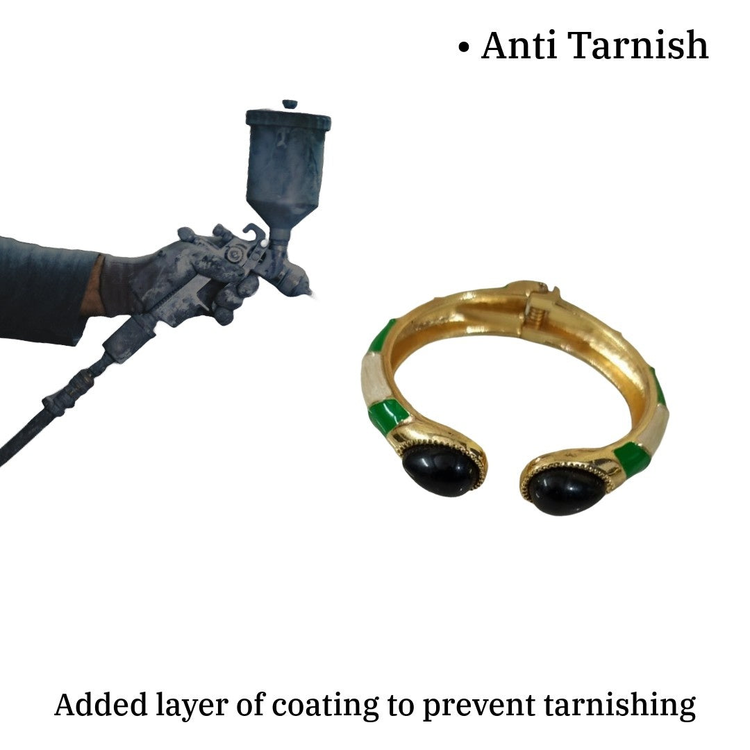 One of the most captivating elements of this cuff bracelet is its dramatic colour palette. The deep black oval stones symbolize strength, confidence, and mystery, while the green enamel accents add a refreshing touch of vibrancy and elegance. Together, they create a visually powerful contrast against the warm gold plating.