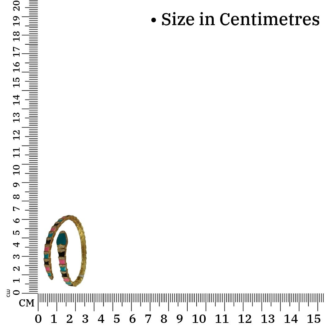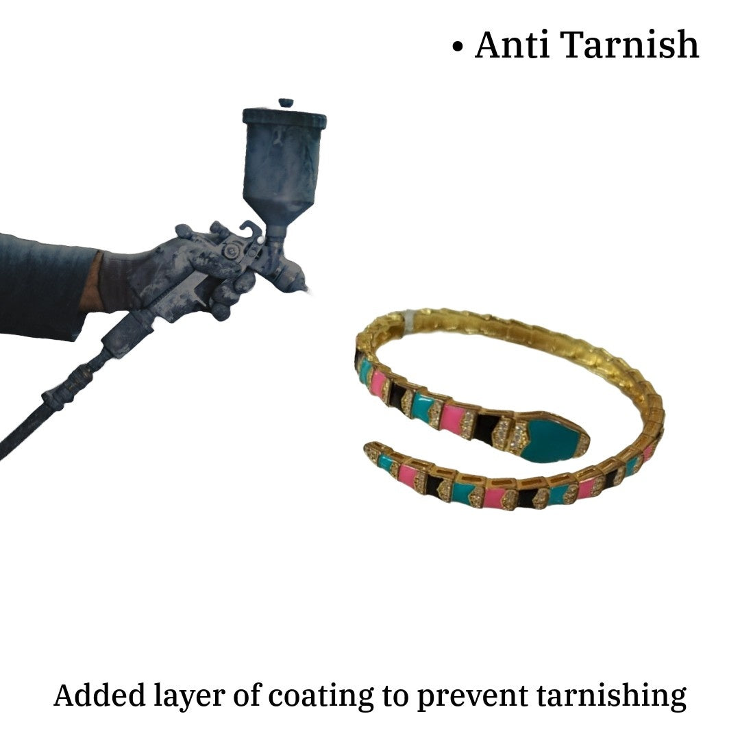 What truly sets this bracelet apart is its multicolor enamel work in turquoise, pink, and black. The colours are carefully chosen to create a striking contrast against the gold base, making the snake design come alive.