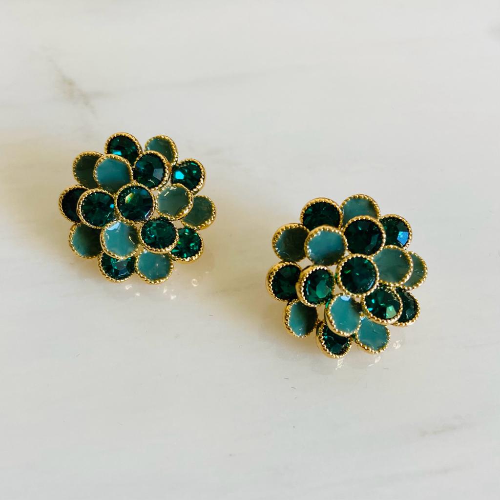 Crafted with care, these earrings feature a beautiful emerald green stone at the centre, which is surrounded by sparkling gold plated design that catches the light from every angle. The intricate design of the earrings is reminiscent of classic and timeless jewellery pieces, while still maintaining a modern edge..